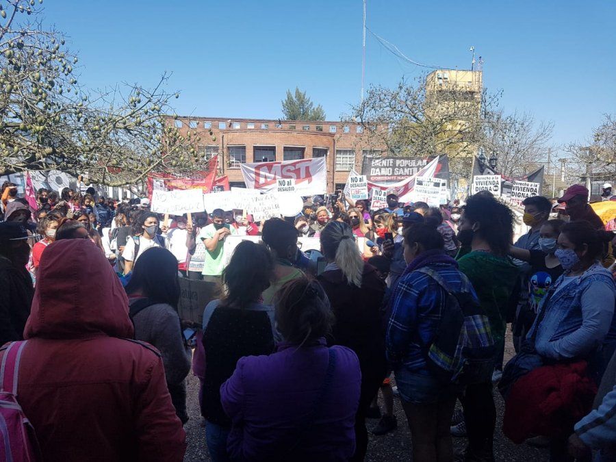 Representantes de movimientos sociales y algunos de los protagonistas de la masiva toma de tierras de Guernica llevan adelante una manifestación este jueves frente al Municipio de Presidente Perón. Piden la suspensión por el desalojo de la usurpación que ordenó la Justicia.