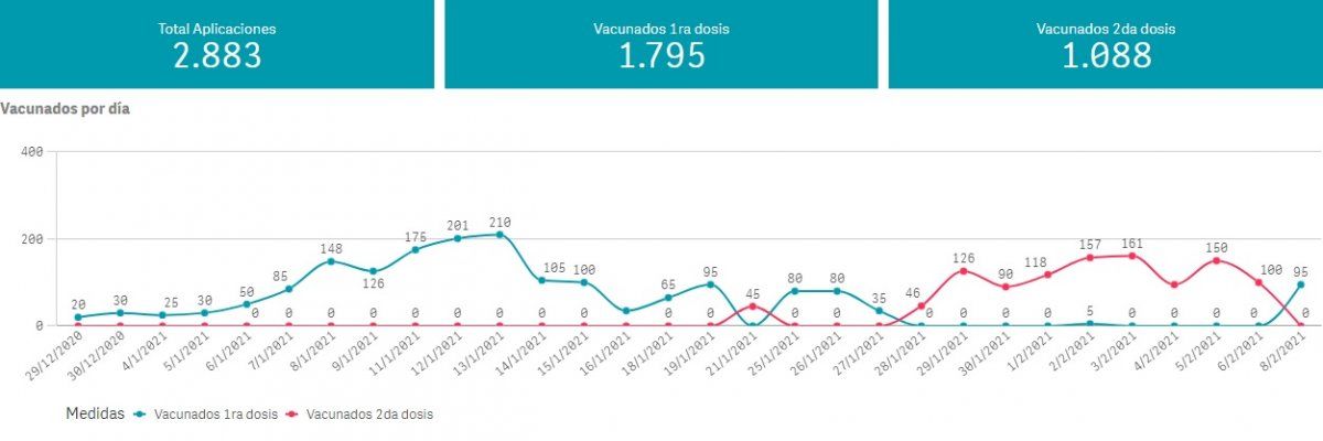 Con respecto a quienes ya recibieron la vacuna, desde el Ministerio de Salud de la provincia de Buenos Aires informaron que, al 8 de febrero, se hicieron 2.883 aplicaciones de la vacuna: 1.795 corresponden a la primer dosis, y 1.088 a la segunda.