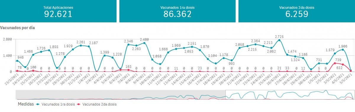 Con respecto a la vacuna, la provincia de Buenos Aires informó que al 5 de mayo, se aplicaron 92.621 dosis de la vacuna contra el coronavirus: 86.362 corresponden a la primer dosis, y 6.259 a la segunda.