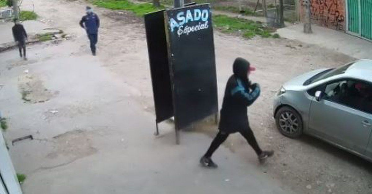En las imágenes se ve cómo en la intersección de las calles Recuero y Aguapey, en González Catán, cuatro personas caminan separadas por una calle de tierra. Uno de ellos desaparece del plano de la cámara y no estaría involucrado en el asalto, pero los otros tres se dirigieron hacia el auto que se encontraba estacionado con su dueño adentro, un vehículo Volkswagen UP de color gris plata.