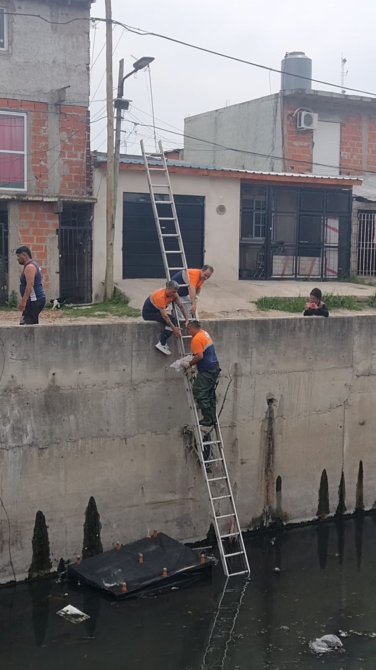 Finalmente, después de un prolongado operativo en el que participaron varios integrantes del servicio de emergencias se logró rescatar al cachorro que intentaba ascender por la pared de la rectificación que rodea al curso de agua.