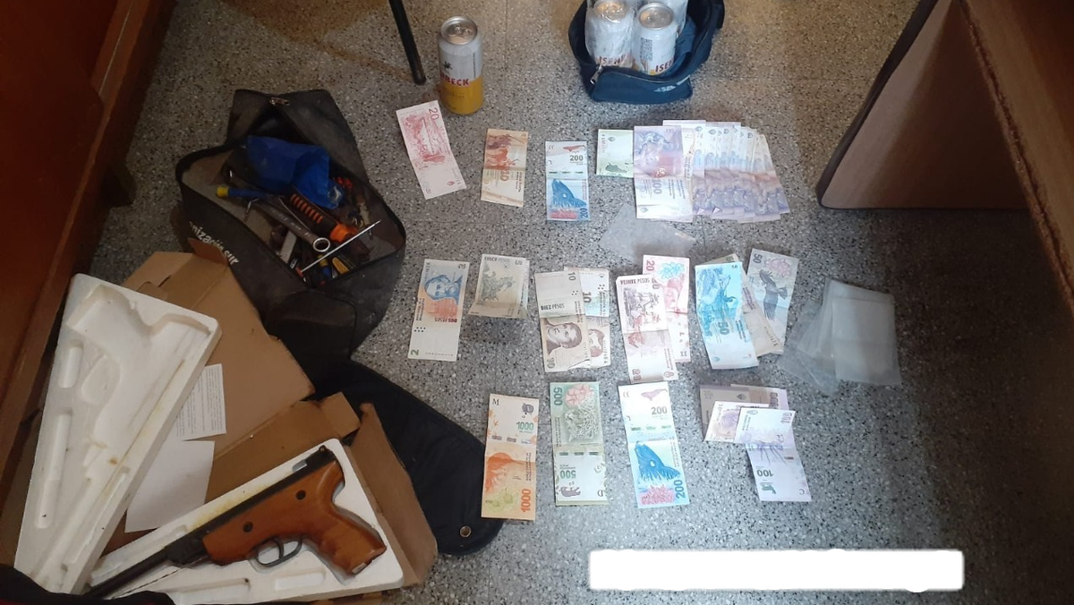 El joven, de 27 años y con domicilio en Lanús, llevaba en sus manos varias bolsos. Cuando los policías lo interceptaron, lo redujeron y requisaron en el lugar. Como resultado hallaron entre sus prendas un arma de tipo aire comprimido a pistón marca Ayreco calibre 4.5, más $3.200 pesos en efectivo y varias herramientas.