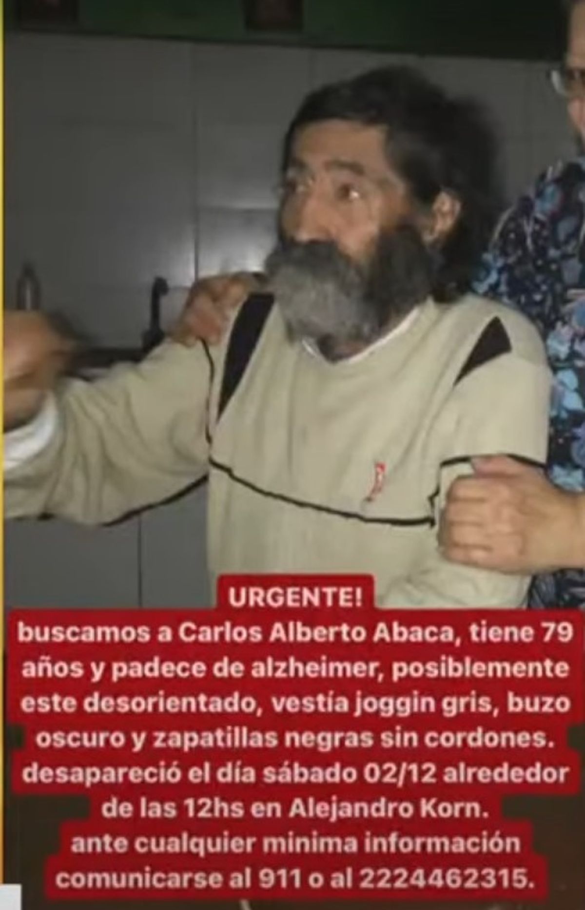 Carlos Abaca, un hombre de 79 años con Alzheimer, desapareció el pasado sábado 2 de diciembre en Alejandro Korn. Su familia lo busca con desesperación y pide ayuda a la comunidad para encontrarlo.