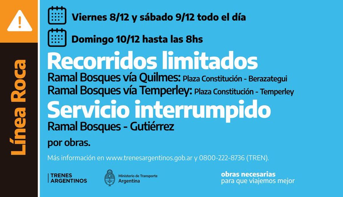 Tanto el viernes como el sábado, a lo largo de todo el día, los usuarios que utilicen el Ramal Bosques Vía Quilmes verán afectado su recorrido, ya que el Tren Roca circulará desde Plaza Constitución hasta Berazategui. De manera similar pasará con el Ramal Bosques Vía Temperley que solamente cubrirá el trayecto desde Plaza Constitución hasta Temperley.