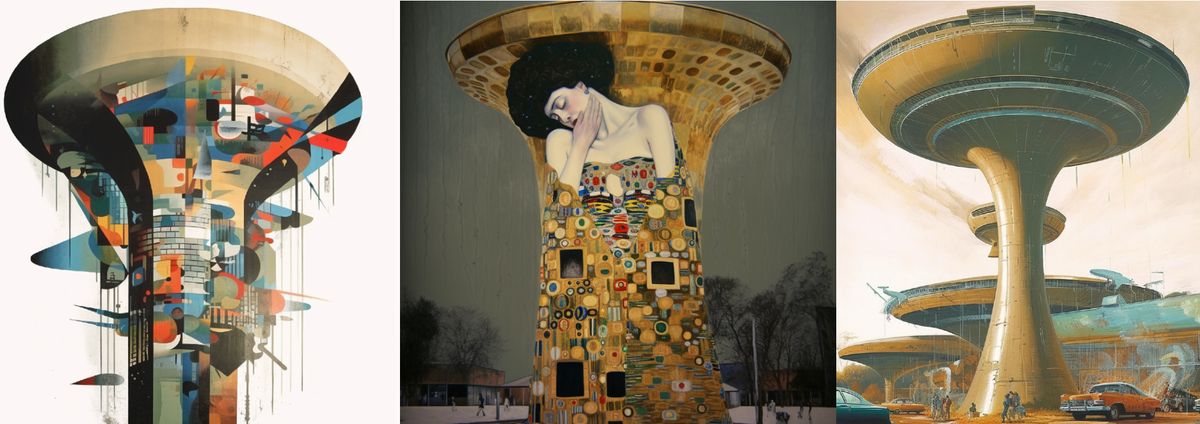 Federico Pesce utiliza la IA, “herramienta prometedora para el futuro del diseño y el arte”, para crear imágenes alusivas a la ciudad, entre las que sobresalen distintas versiones virtuales del Tanque de Monte Grande. Las mismas estarán en exposición y venta -en formato postal y sticker- el próximo 30 de abril en el “Festival en Puerta Verde”, en Dardo Rocha 392, donde también se presentarán muestras de distintos talleres artísticos que se dictan en el nuevo espacio.