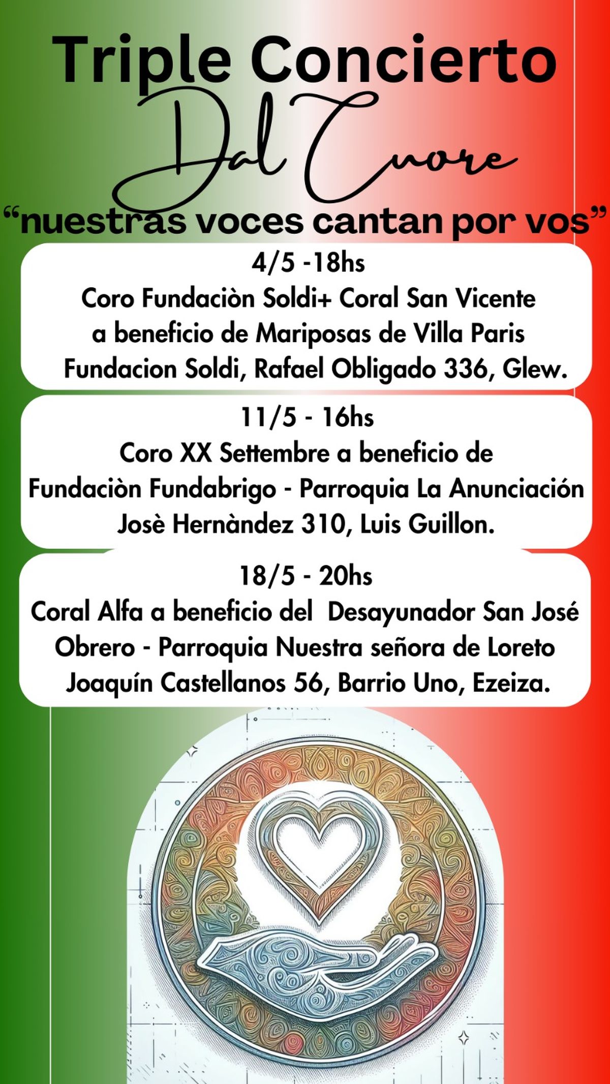 Los cuatro coros participarán en los tres conciertos, aunque cada uno ayudará a su respectiva asociación benéfica. Sin embargo, decidieron unirse en este evento llamado "Dal Cuore: Nuestras voces cantan por vos", para aportar su grano de arena.
