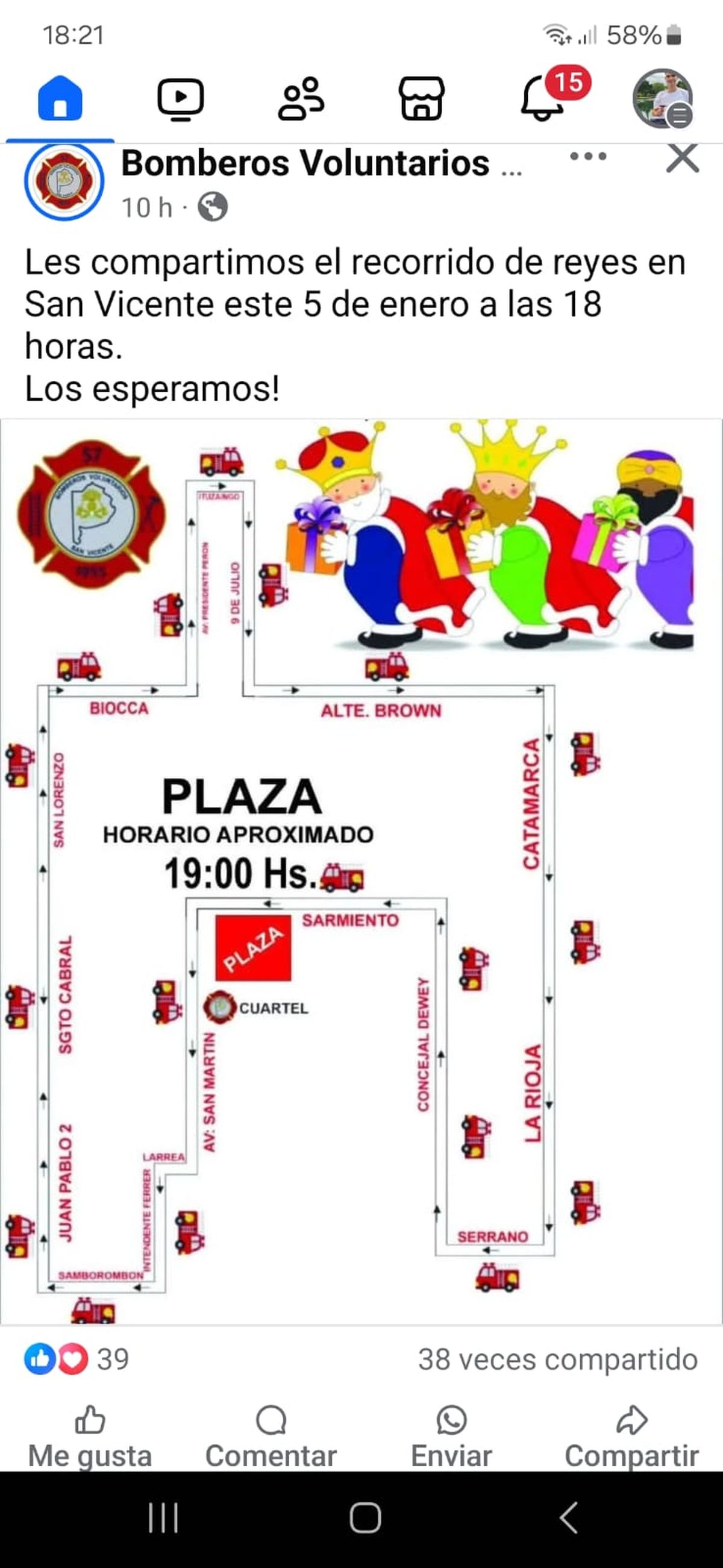 Organizada por el Municipio de San Vicente y los bomberos voluntarios locales, la caravana de los Reyes Magos partirá desde el cuartel de bomberos voluntarios en la Avenida San Martín. El recorrido continuará por las calles Larrea, Intendente Ferrer, Samborombon y Juan Pablo Segundo, Sargento Cabral y San Lorenzo. Luego, seguirá por Biocca, Avenida Presidente Perón, Ituzaingo, Avenida 9 de Julio, Almirante Brown, Catamarca, La Rioja, Serrano, Concejal Dewy y finalizará en la plaza Mariano Moreno.