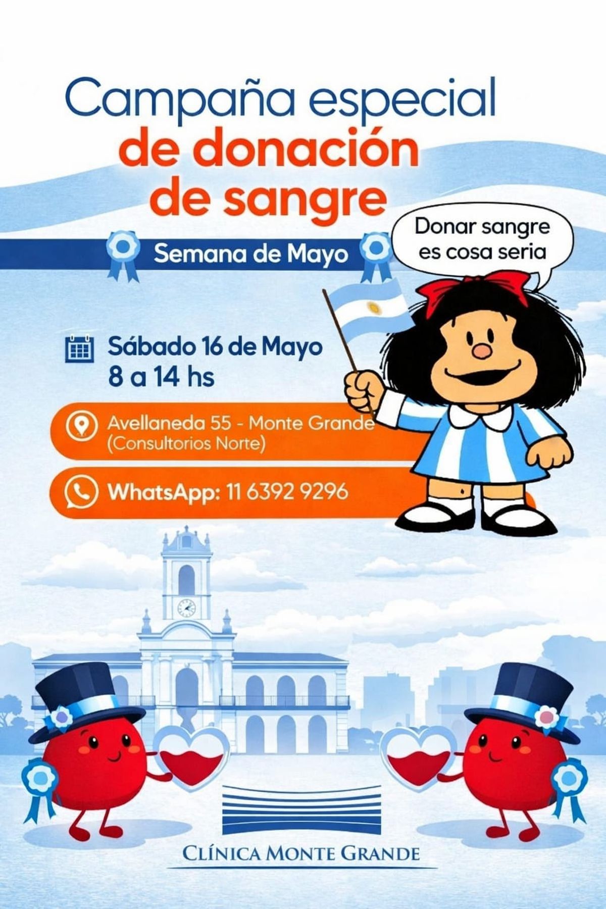 En el marco de la Semana de Mayo, se realizará una campaña especial de donación de sangre en Clínica Monte Grande, con el objetivo de reforzar las reservas y promover la participación solidaria de la comunidad.