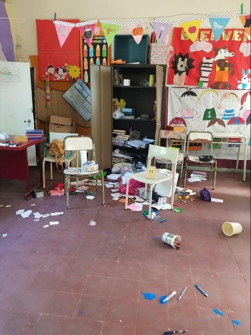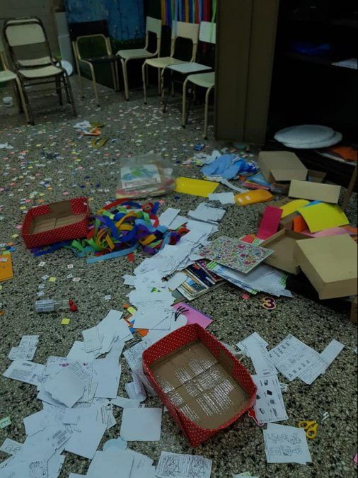 Muebles rotos, hojas de carpetas con actividades y materiales para los chicos desparramados, grafitis con pintura en los pizarrones, e incluso rollos de papel higiénico tirados en el patio, fueron algunos de los hechos de vandalismo.