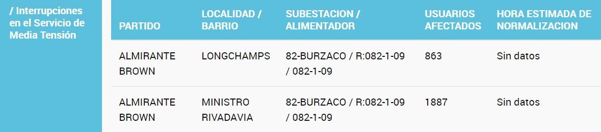 De acuerdo a la información que brinda Edesur a través de la página den Ente Regulador (ENRE), al momento hay 1887 clientes afectados en Ministro Rivadavia, 863 en Longchamps, 78 en Mármol, 56 en Adrogué y 34 en Burzaco.