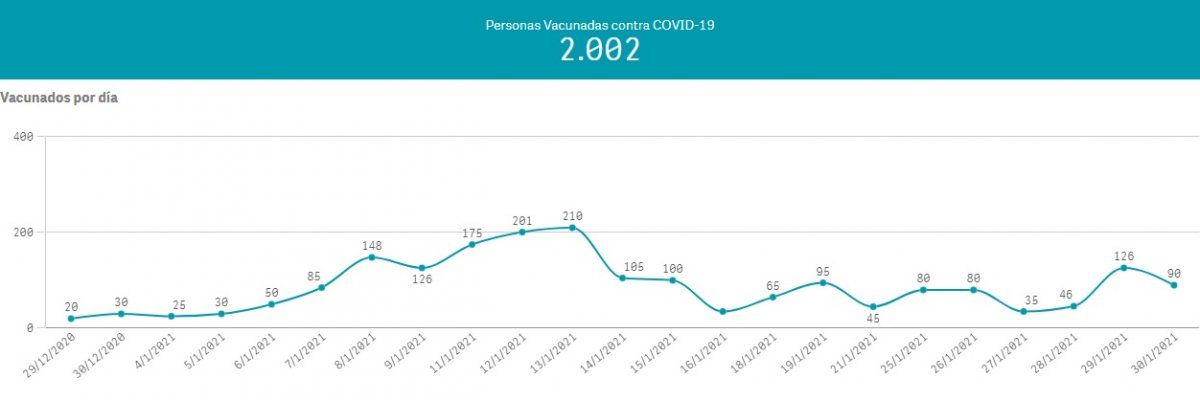 Con respecto a los vacunados, la provincia de Buenos Aires informó que al 30 de enero, 2.002 personas recibieron la vacuna Sputnik V contra el coronavirus. Los mismos corresponden al personal de salud del distrito. Además, algunos ya recibieron la segunda dosis de la vacuna.