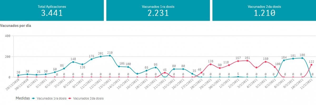 Con respecto a la vacuna, la provincia de Buenos Aires informó que al 11 de febrero, se aplicaron 3.441 dosis de la vacuna Sputnik V contra el coronavirus: 2.231 corresponden a la primer dosis, y 1.210 a la segunda. Los mismos corresponden al personal de salud y adultos mayores del distrito.