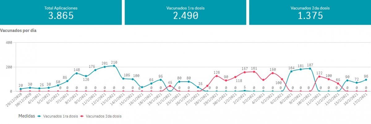Con respecto a la vacuna, la provincia de Buenos Aires informó que al 18 de febrero, se aplicaron 3.865 dosis de la vacuna Sputnik V contra el coronavirus: 2.490 corresponden a la primer dosis, y 1.375 a la segunda. Los mismos corresponden al personal de salud y adultos mayores del distrito.