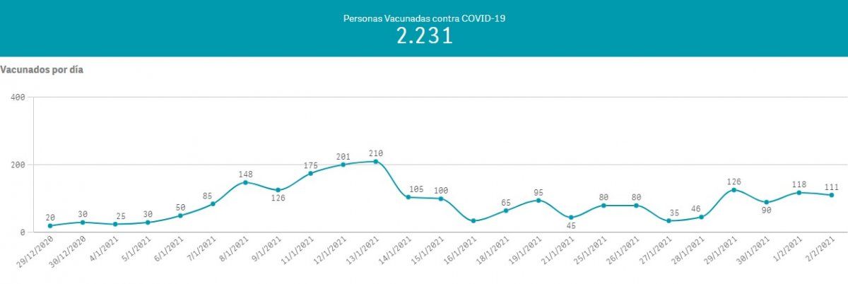Con respecto a los vacunados, la provincia de Buenos Aires informó que al 2 de febrero, hay 2.231 personas recibieron la vacuna Sputnik V contra el coronavirus. Los mismos corresponden al personal de salud del distrito. Además, algunos ya recibieron la segunda dosis de la vacuna.