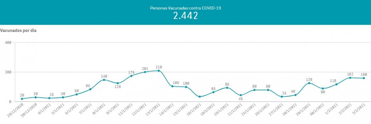 Con respecto a los vacunados, la provincia de Buenos Aires informó que al 3 de febrero, hay 2.442 personas recibieron la vacuna Sputnik V contra el coronavirus. Los mismos corresponden al personal de salud del distrito. Además, algunos ya recibieron la segunda dosis de la vacuna.