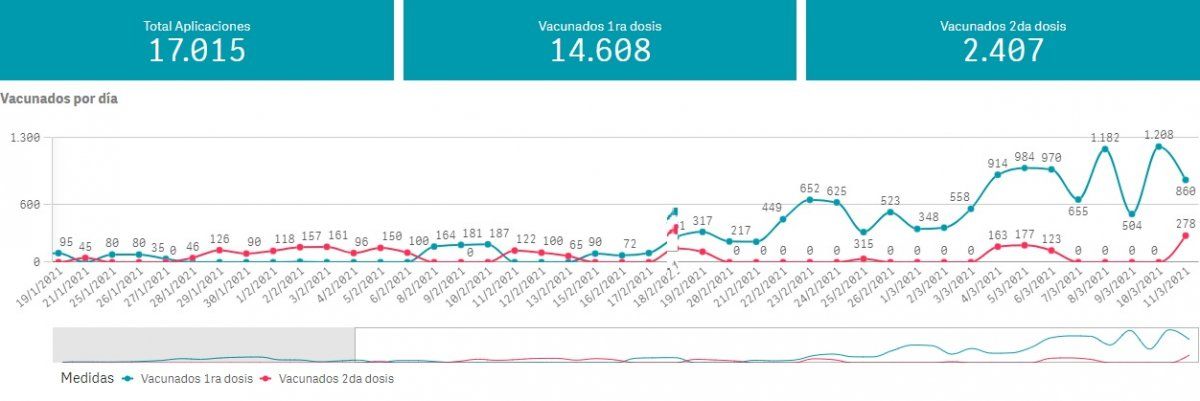 Con respecto a la vacuna, la provincia de Buenos Aires informó que al 10 de marzo, se aplicaron 17.015 dosis de la vacuna contra el coronavirus: 14.608 corresponden a la primer dosis, y 2.407 a la segunda.