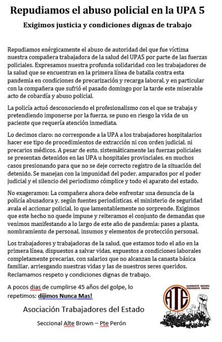 Desde el gremio estatal aseguraron que se trató de un "abuso de autoridad", y manifestaron su solidaridad con Claudia, la enfermera afectada por el hecho, quien se encuentra de licencia, y el resto de los trabajadores de la salud "que se encuentran en la primera línea de batalla contra esta pandemia en condiciones de precarización y recarga laboral".