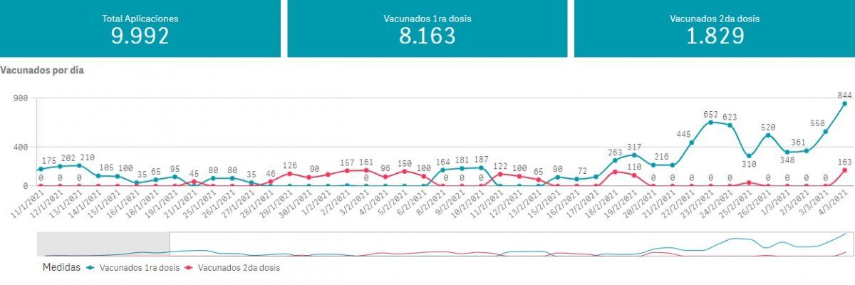 Con respecto a la vacuna, la provincia de Buenos Aires informó que al 4 de marzo, se aplicaron 9.992 dosis de la vacuna contra el coronavirus: 8.163 corresponden a la primer dosis, y 1.829 a la segunda.