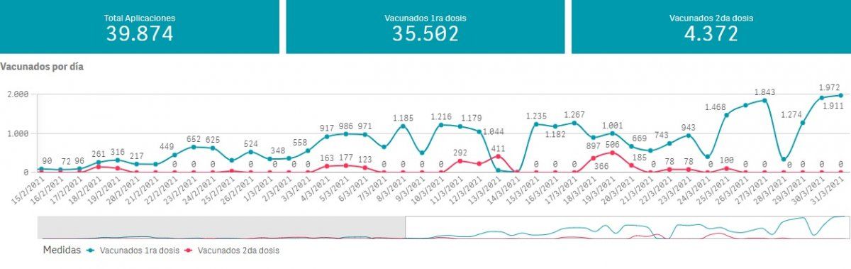 Con respecto a la vacuna, la provincia de Buenos Aires informó que al 30 de marzo, se aplicaron 39.874 dosis de la vacuna contra el coronavirus: 35.502 corresponden a la primer dosis, y 4.372 a la segunda.