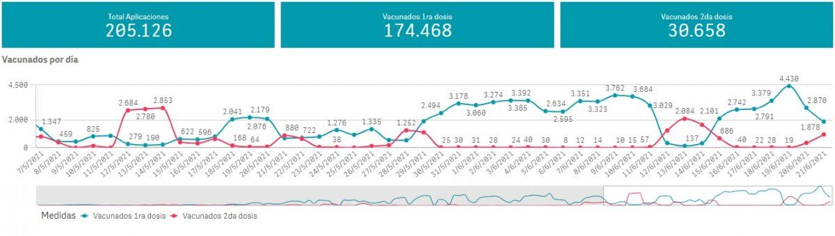 Así, el total de vacunas aplicadas alcanzó las 205.126 inyecciones aplicadas: de estas, 174.468 corresponden a la primera dosis del medicamento contra el coronavirus, mientras que 30.658 son de la segunda.