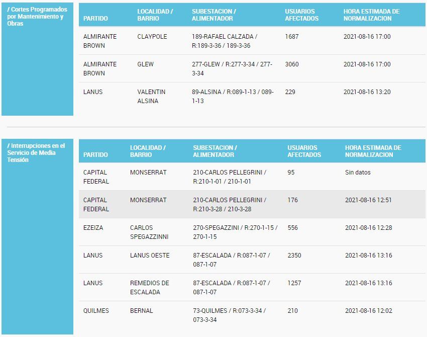 Por otra parte, miles de vecinos de Lanús y Ezeiza sufren "Interrupciones en el Servicio de Media Tensión". Puntualmente, las obras en el subalimentador de Remedios de Escalada dejaron sin luz a 3607 usuarios. Mientras que en Spegazzinni hay 556 casas y comercios afectados.