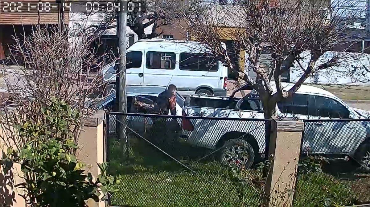Según se ve en las imágenes que un vecino compartió en las redes sociales, los malvivientes circulaban a bordo de un auto gris y se frenaron repentinamente frente a una camioneta blanca que estaba estacionada en la vereda.