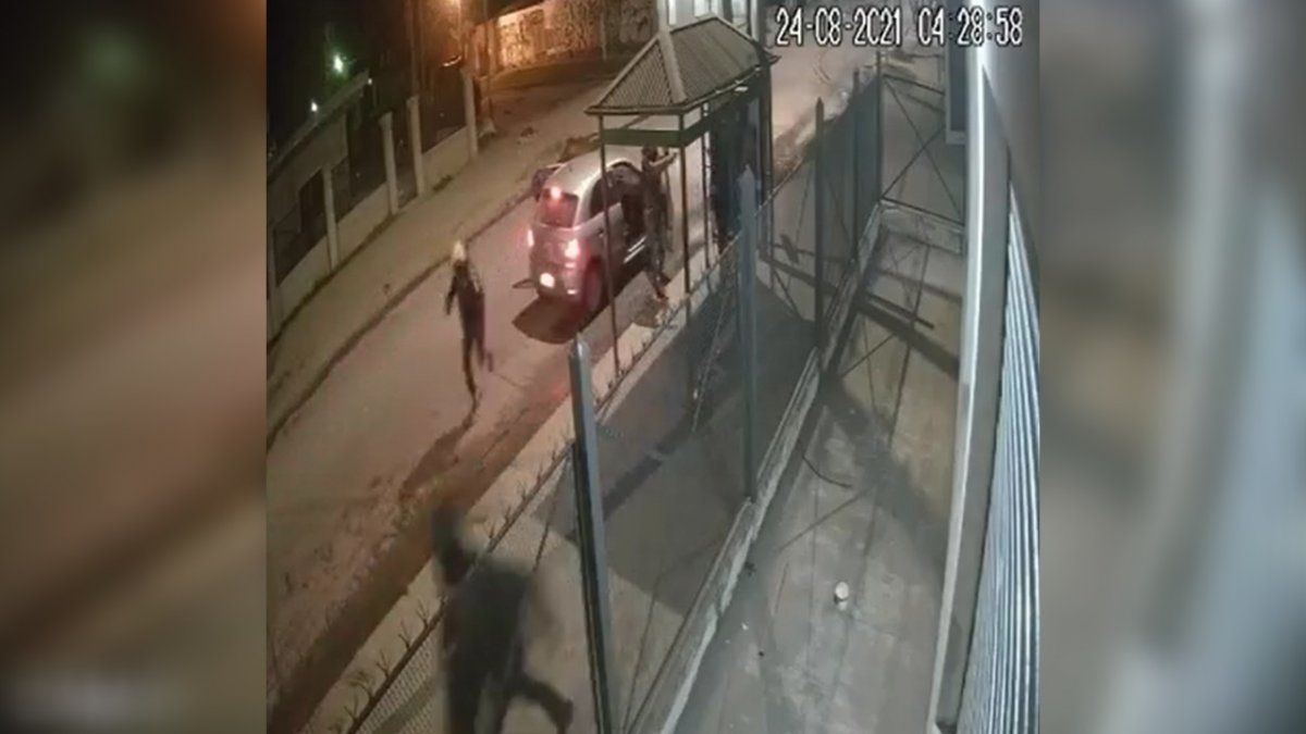 Según se ve en las imágenes, dos personas se encontraban en la parada ubicada en la mencionada esquina, cuando un auto gris se frenó en el lugar.