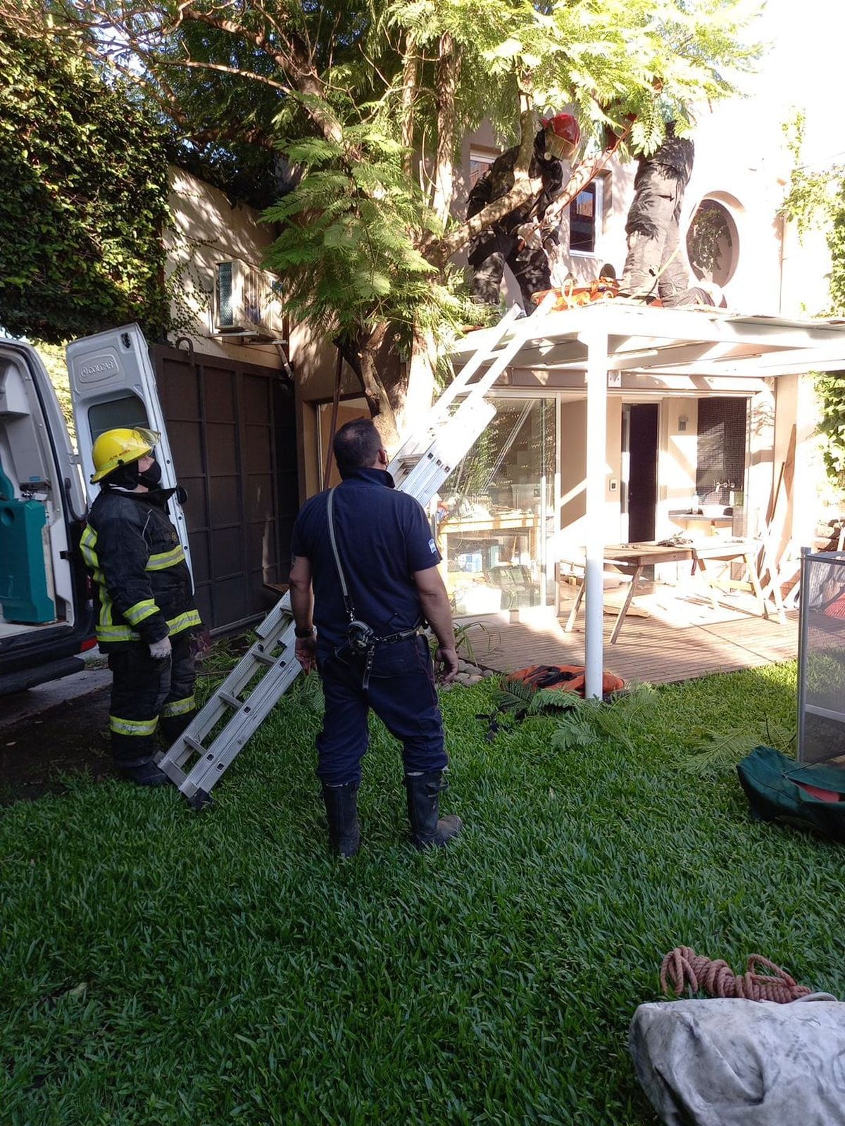 En tanto, las personas que estaban en la casa y escucharon la caída rápidamente solicitaron auxilio y en pocos minutos arribaron los bomberos Almirante Brown, quienes realizaron las maniobras de descenso del vecino.