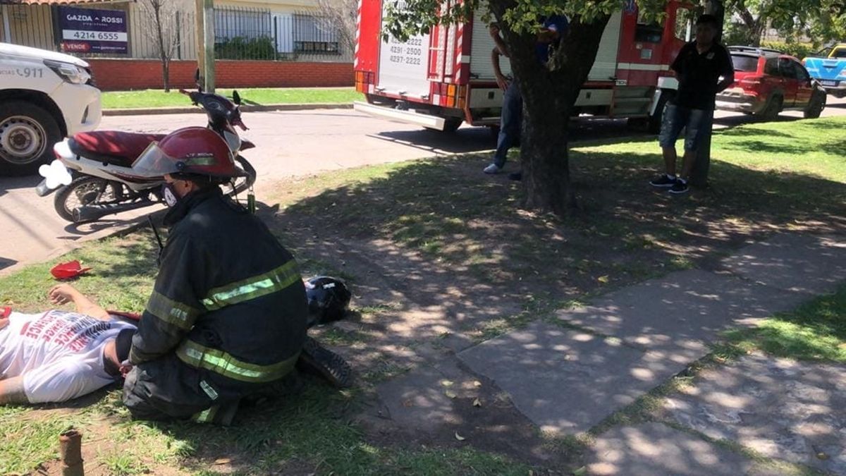En minutos, Bomberos de Almirante Brown se acercaron para auxiliar al motociclista, que quedó tirado sobre la vereda.