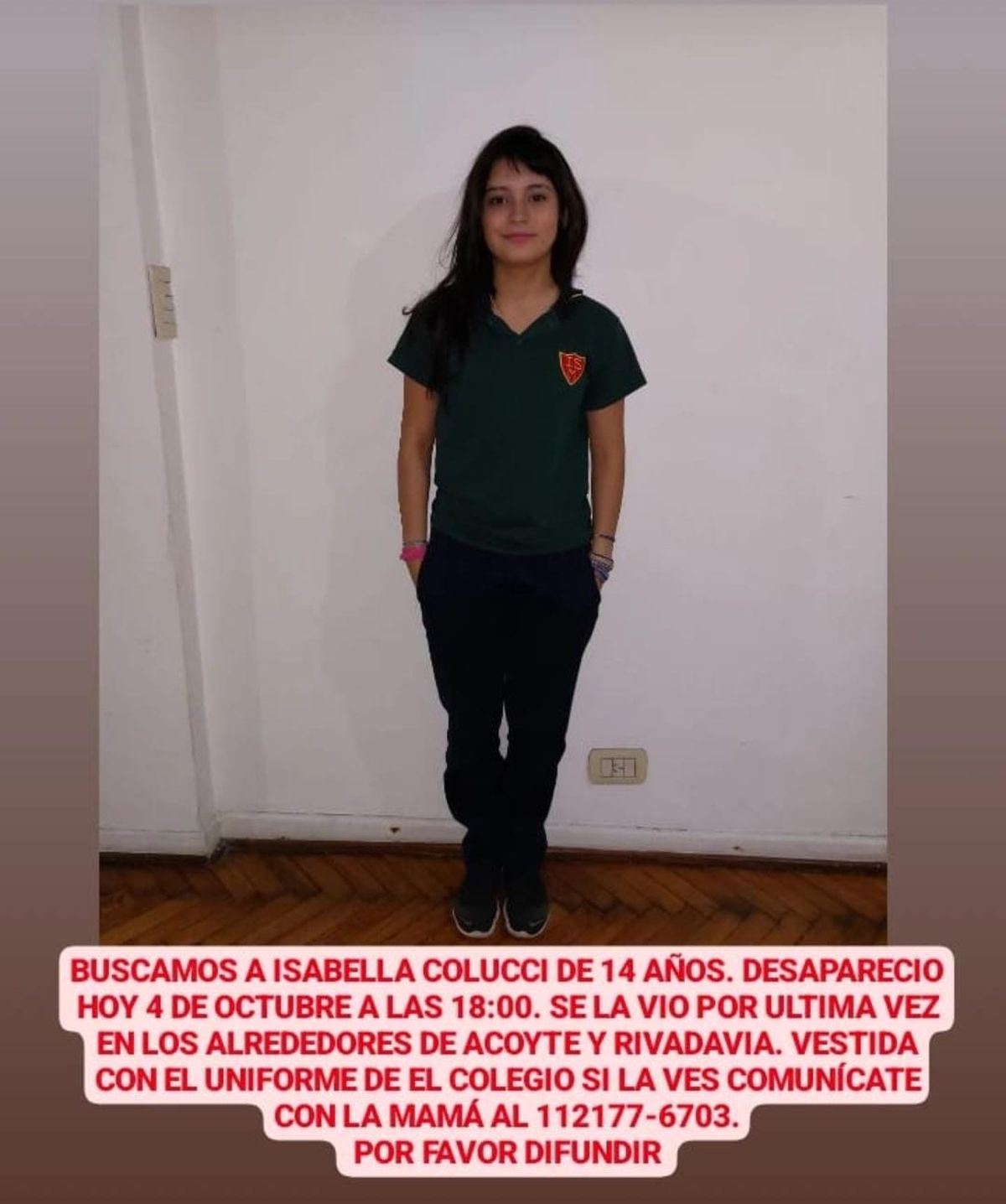 Isabella Colucci es alumna del Instituto Santamaría del barrio porteño de Caballito y fue en la tarde de miércoles que le dijo a su madre que iba a estar con unos compañeros en una estación de servicio en la esquina del colegio. Le pidió que vaya a buscarla a las 19 horas, pero en el momento en que la madre arribó al lugar, sus compañeros dijeron que no estaba con ellos y que se había ido con un chico llamado Brian.
