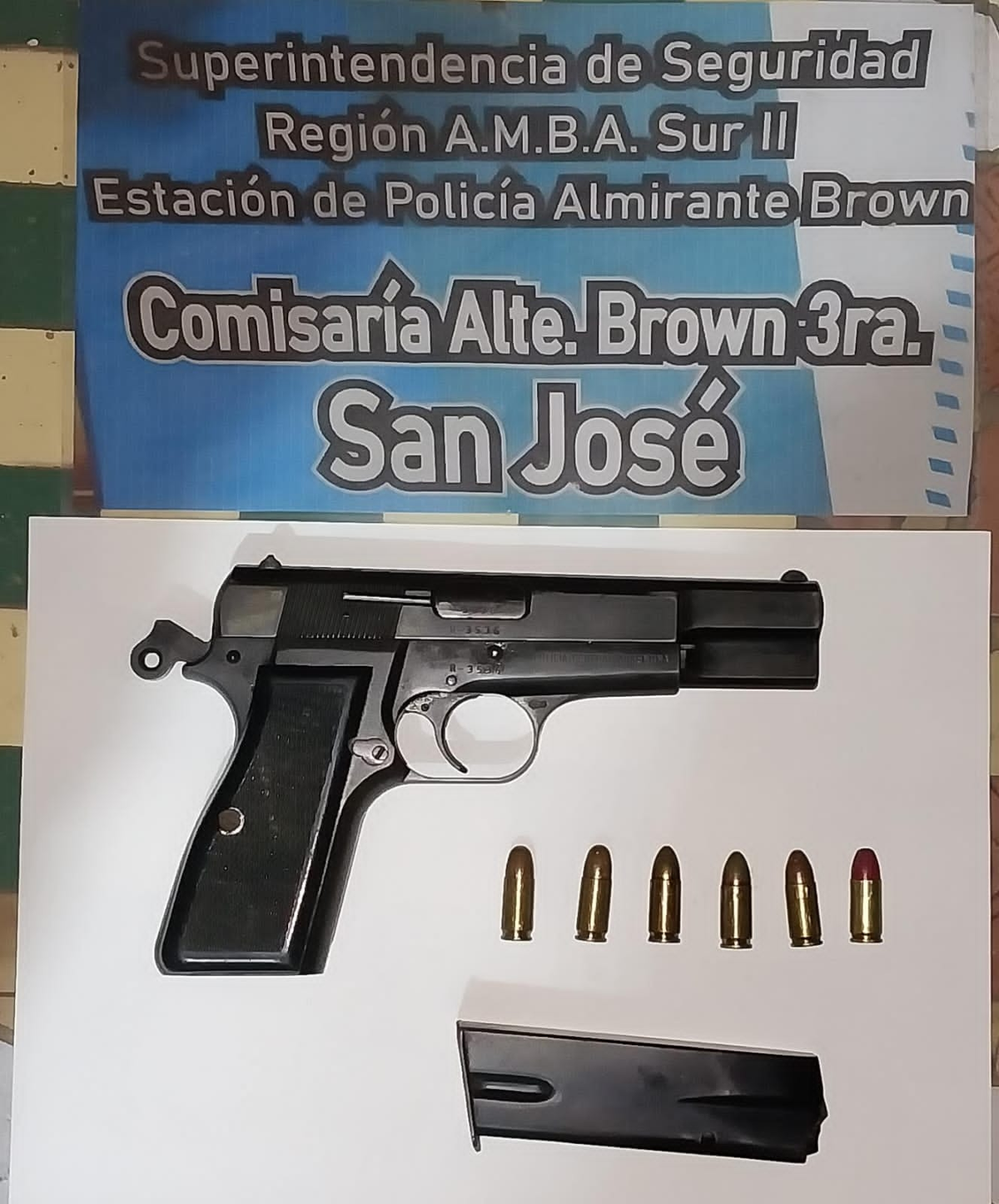 Durante el allanamiento, el personal policial no solo detuvo al acusado de 46 años por violencia de género, sino también secuestraron la pistola Browning calibre 9 milímetros con 6 cartuchos intactos que habría utilizado el sospechoso en el ataque contra la víctima.