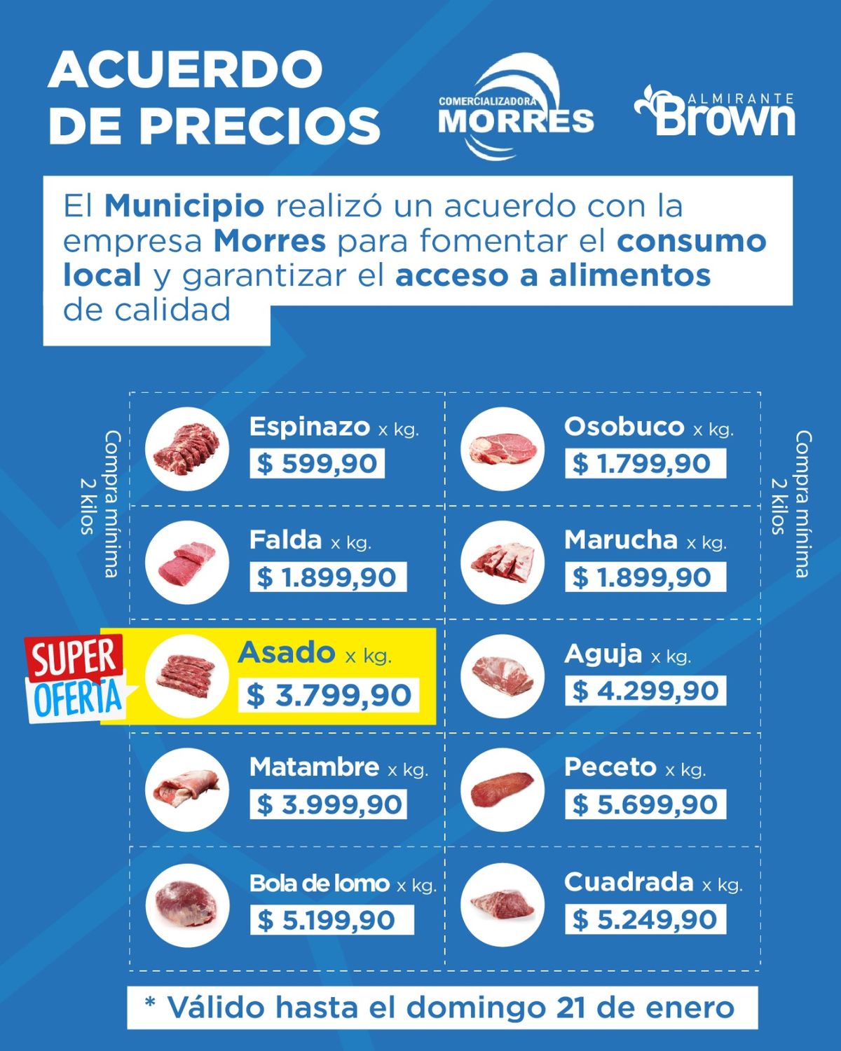 El Municipio de Almirante Brown informó que se prolongará hasta el domingo 21 de enero el Acuerdo de Precios que abarca a una decena de cortes de carne y destacó que se sumó una nueva sucursal en la localidad de Longchamps.