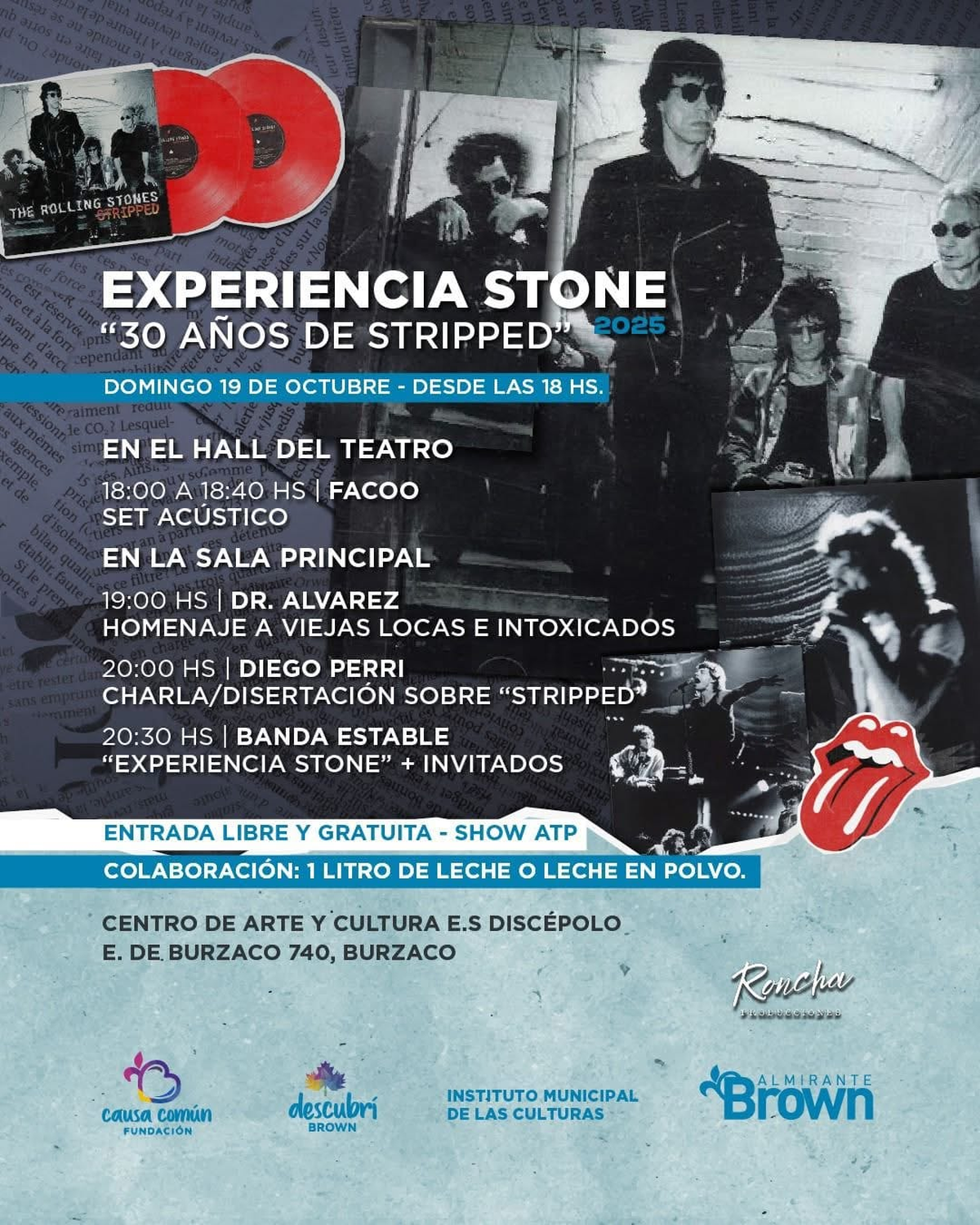 El próximo domingo 19 de octubre, el Municipio de Almirante Brown llevará adelante una nueva edición de “Experiencia Stone”, una jornada dedicada a celebrar los 30 años del álbum Stripped de The Rolling Stones. El evento contará con música en vivo, charlas y homenajes.