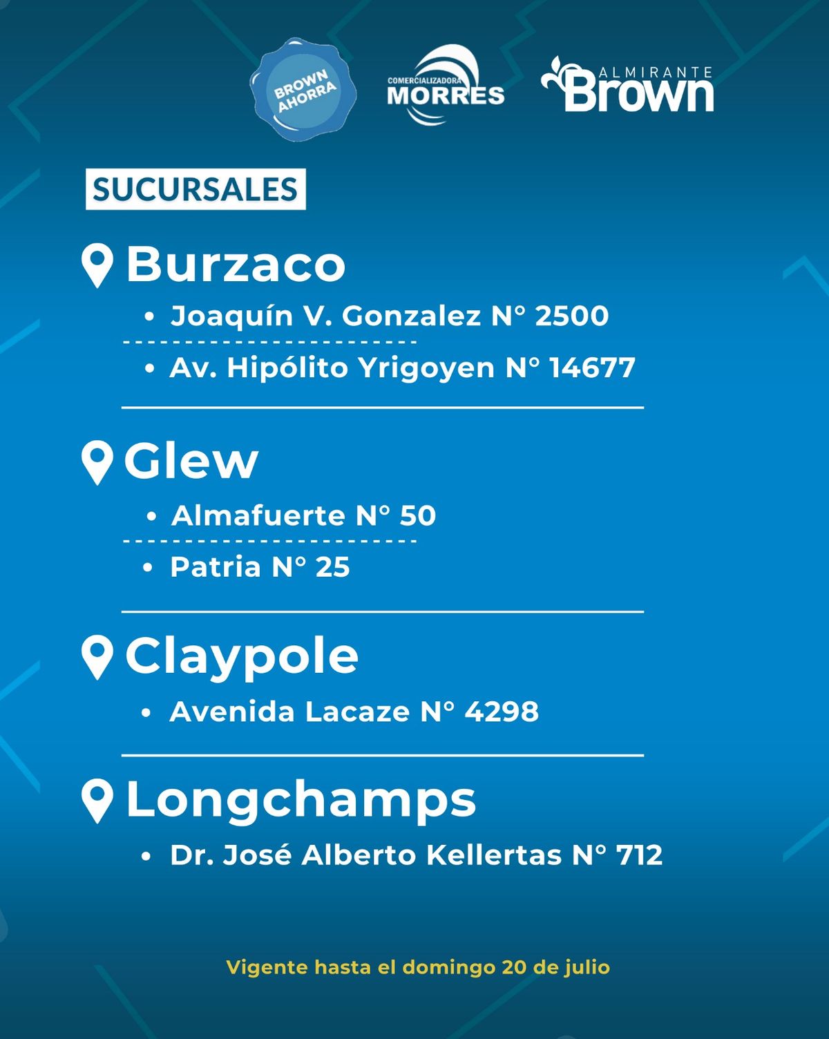 Se trata de los acuerdos establecidos entre la Comuna con la empresa Morres, en sus sucursales ubicadas en Hipólito Yrigoyen N°14.677 y en Joaquín V. González N° 2500 (Burzaco); Avenida Lacaze N° 4298 (Claypole); Almafuerte N° 50 y Patria N° 25, (Glew); y en José Alberto Kellertas N° 712 (Longchamps), cuya atención inicia a las 13 horas.