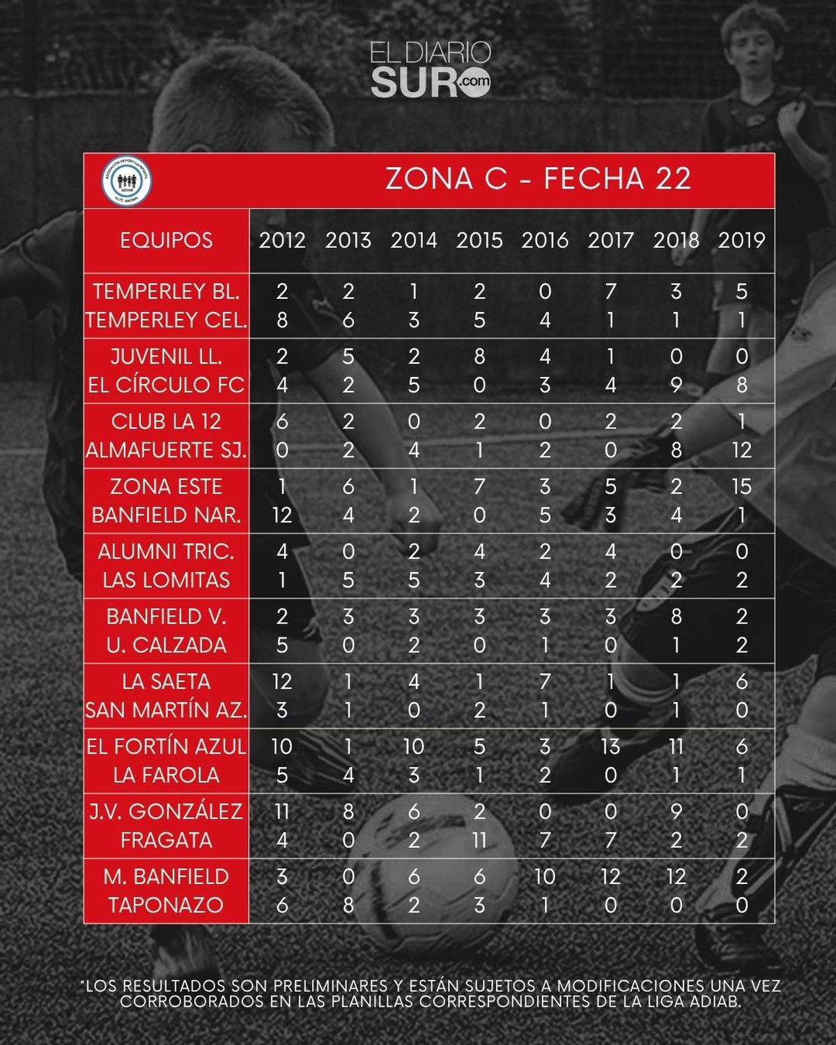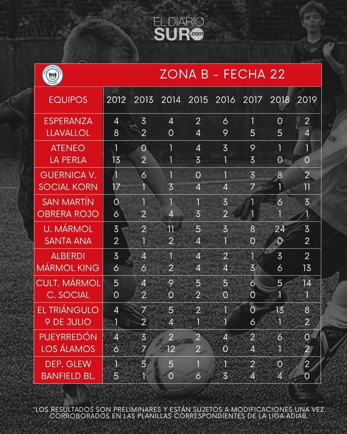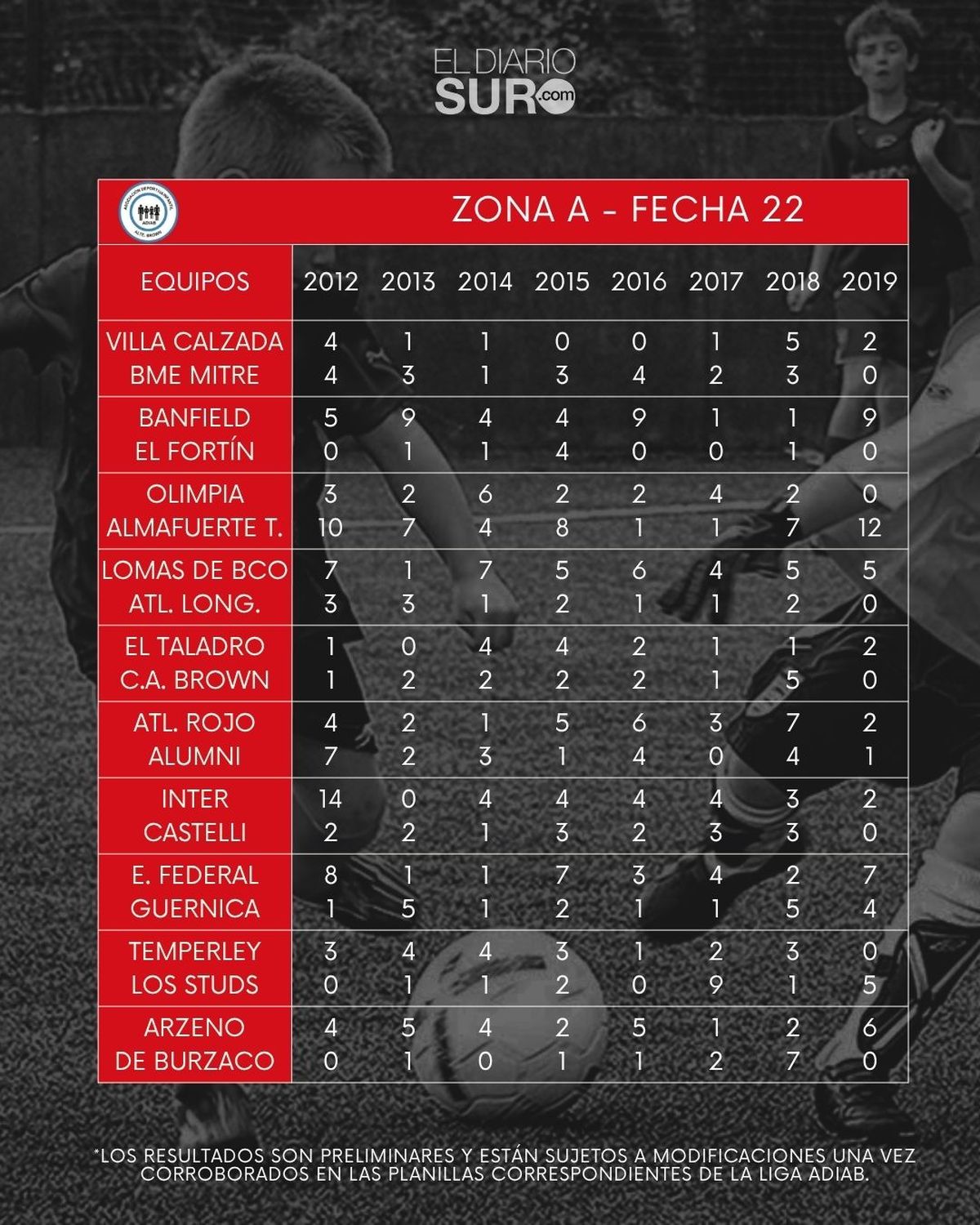 Los resultados son preliminares y están sujetos a modificaciones una vez corroborados en las planillas correspondientes de la liga ADIAB. No son información definitiva.