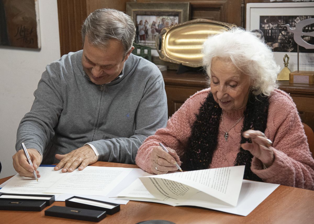 El intendente de Almirante Brown, Mariano Cascallares, y la presidenta de Abuelas de Plaza de Mayo, Estela de Carlotto, protagonizaron un emotivo encuentro en el que firmaron un convenio de colaboración para fortalecer las acciones vinculadas a la defensa de los Derechos Humanos y la búsqueda de nietos apropiados durante la última dictadura cívico-militar.