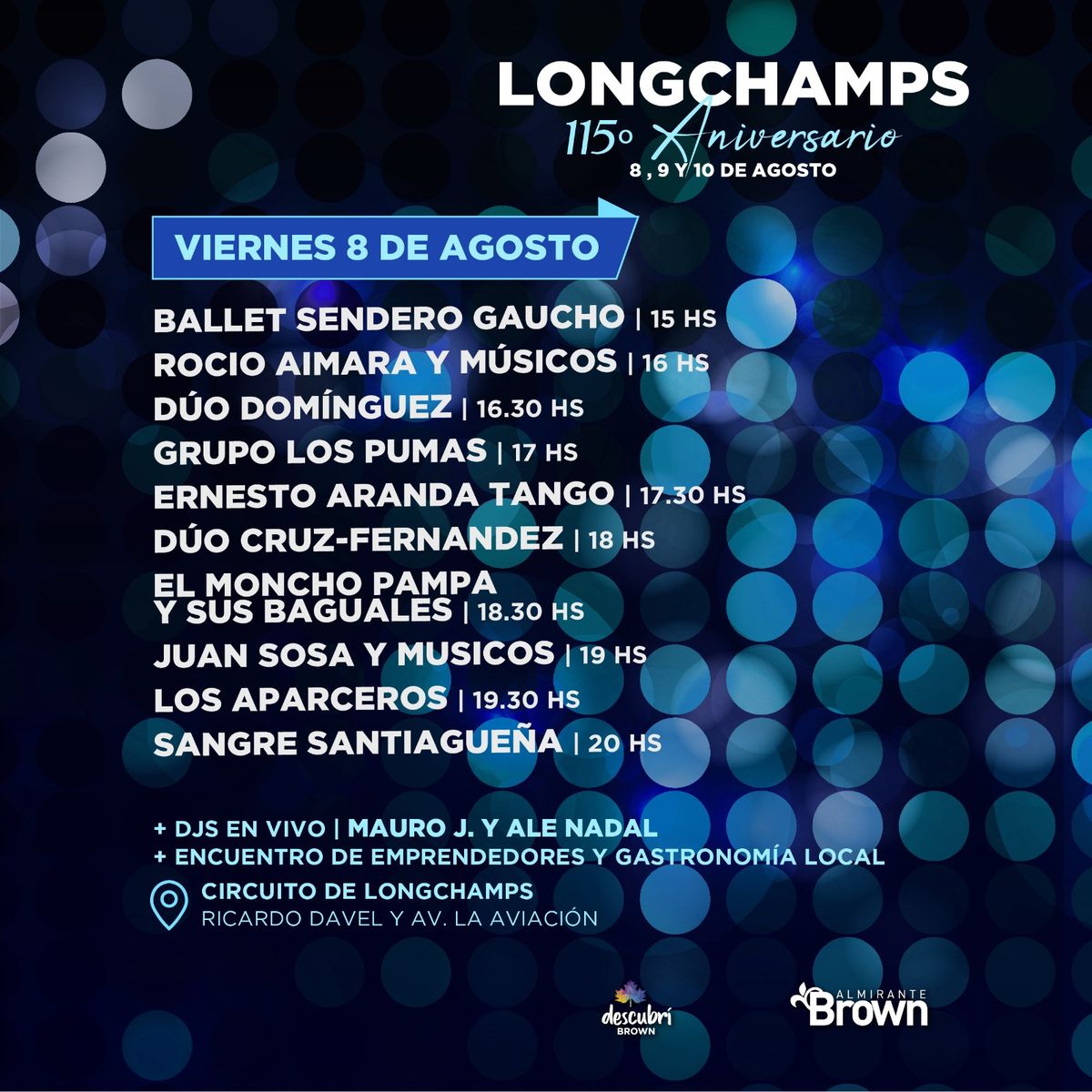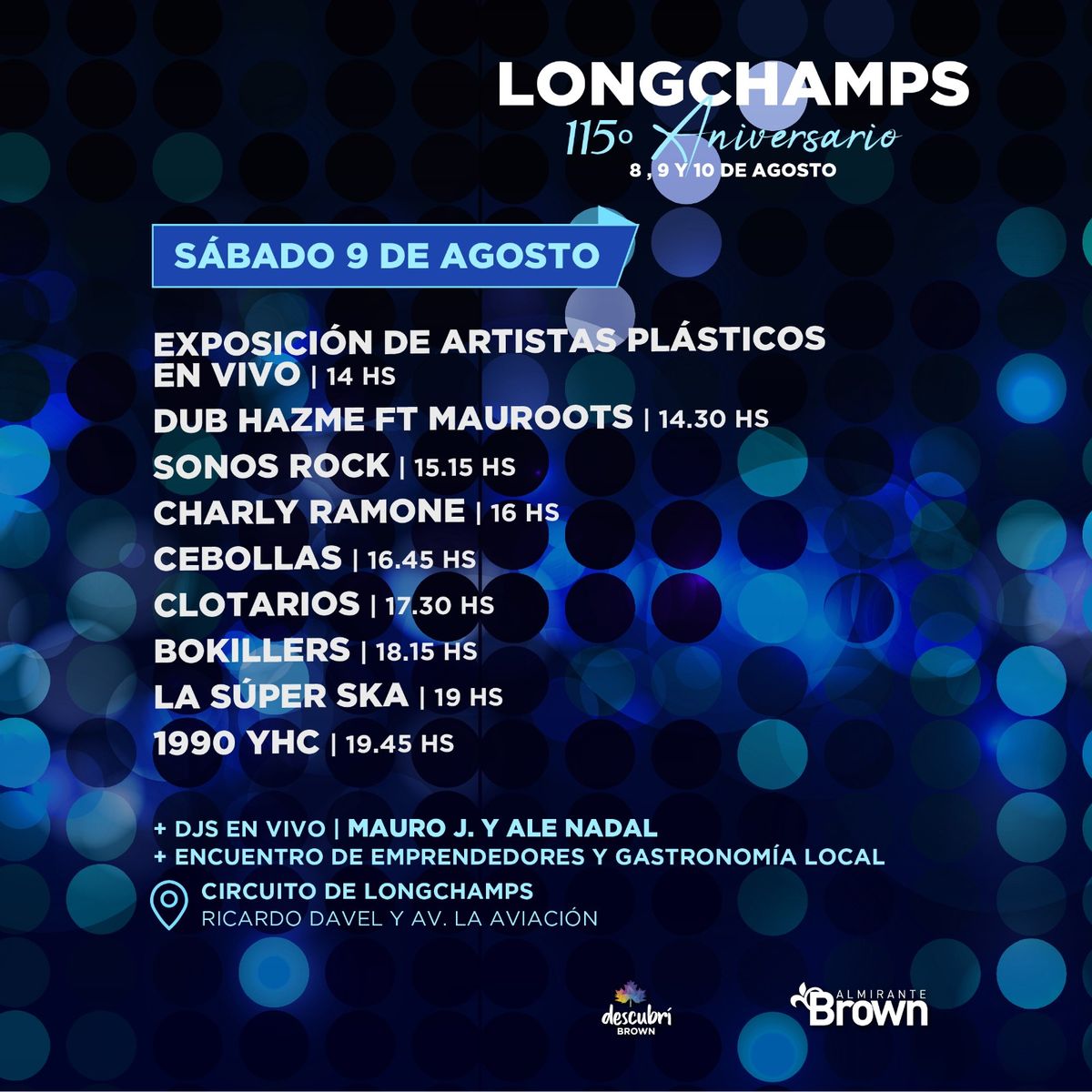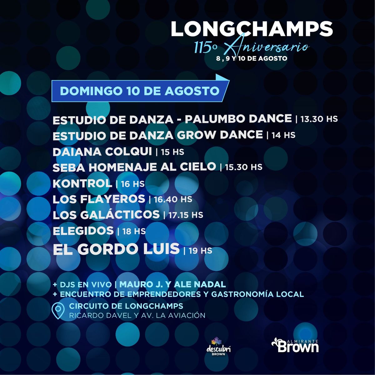 El Municipio de Almirante Brown informó que el 8, 9 y 10 agosto celebrará un nuevo aniversario de Longchamps con numerosas actividades artísticas y recreativas, el encuentro de emprendedores locales y shows en vivo, además del tradicional acto oficial.