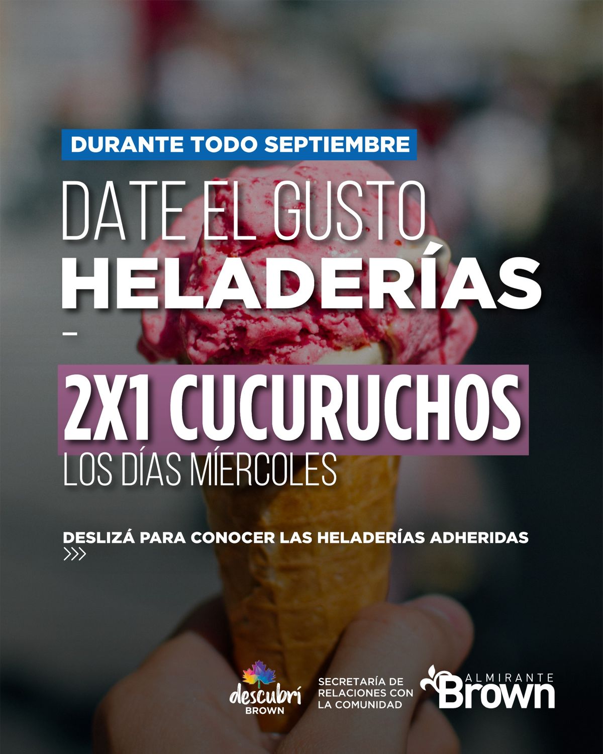 Este y todos los miércoles de septiembre llega el 2 x 1 en heladerías de nuestro distrito, una suculenta promoción de helados en cucurucho. En efecto, durante el mes de la primavera las vecinas y vecinos podrán darse el gusto y acceder a un atractivo descuento que ofrecen diversas heladerías de Almirante Brown.