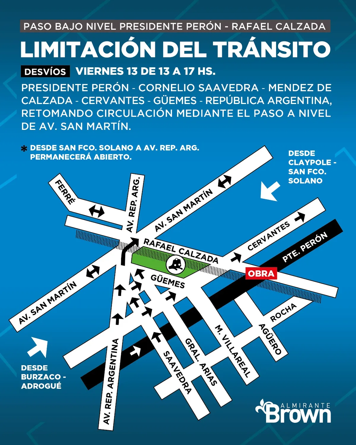 El Municipio de Almirante Brown informó que este viernes 13 de febrero se realizará una limitación temporal del tránsito en el nuevo Paso Bajo Nivel de Rafael Calzada debido a tareas de mantenimiento y limpieza.