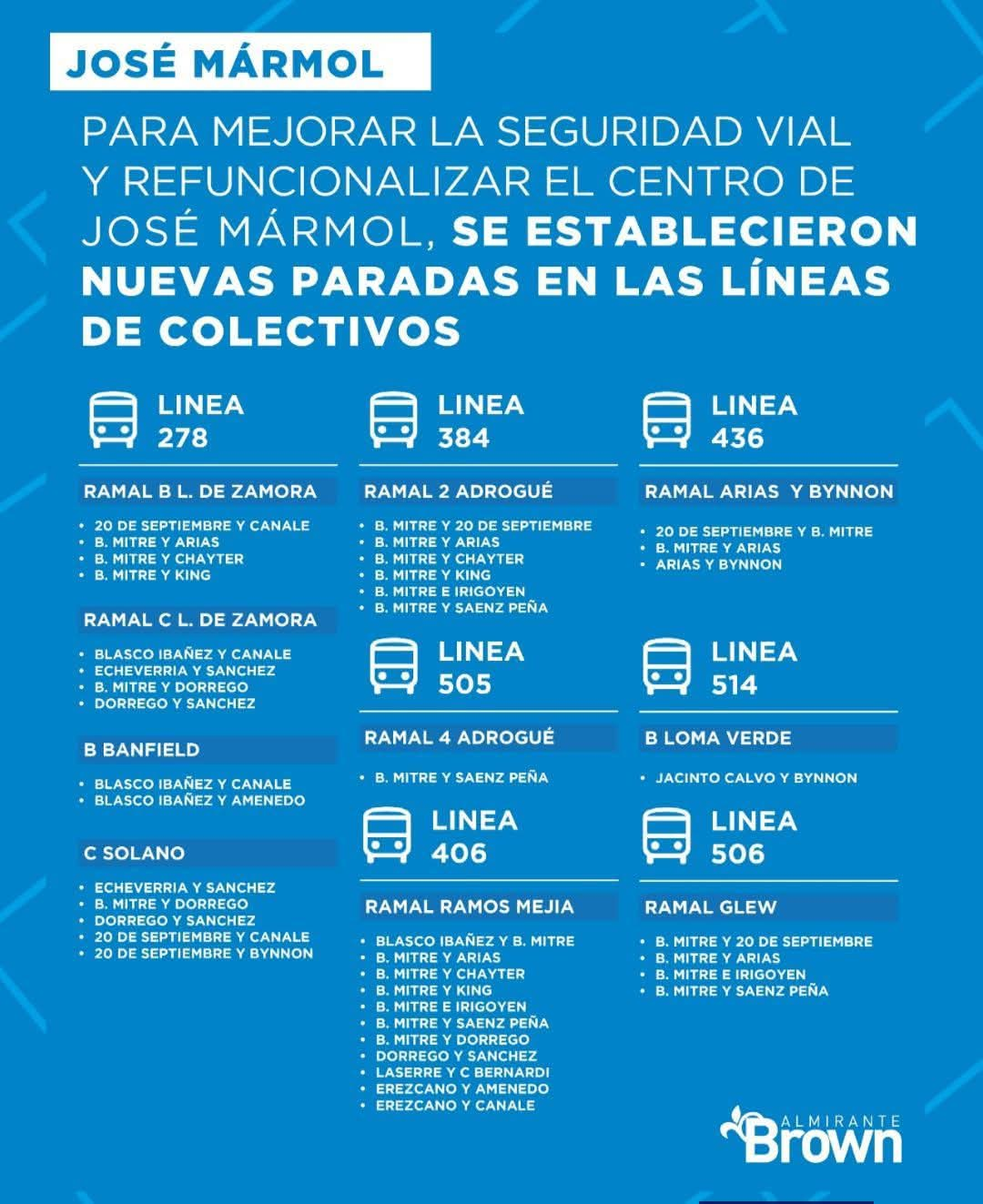 El Municipio de Almirante Brown informó que se establecieron nuevas paradas de colectivos en José Mármol con el objetivo de mejorar la seguridad vial y refuncionalizar el centro de la localidad. La medida alcanza a distintas líneas y ramales que circulan por la zona.