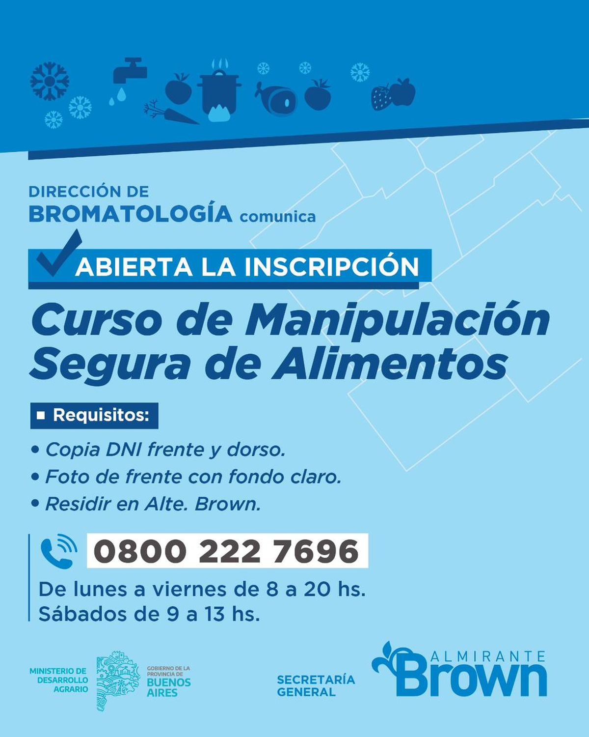 El Municipio de Almirante Brown informó que se encuentra abierta la inscripción para el curso de Manipulación Segura de Alimentos, una capacitación obligatoria destinada a vecinos y vecinas que desarrollan tareas vinculadas a la elaboración, comercialización o manejo de alimentos dentro del distrito.