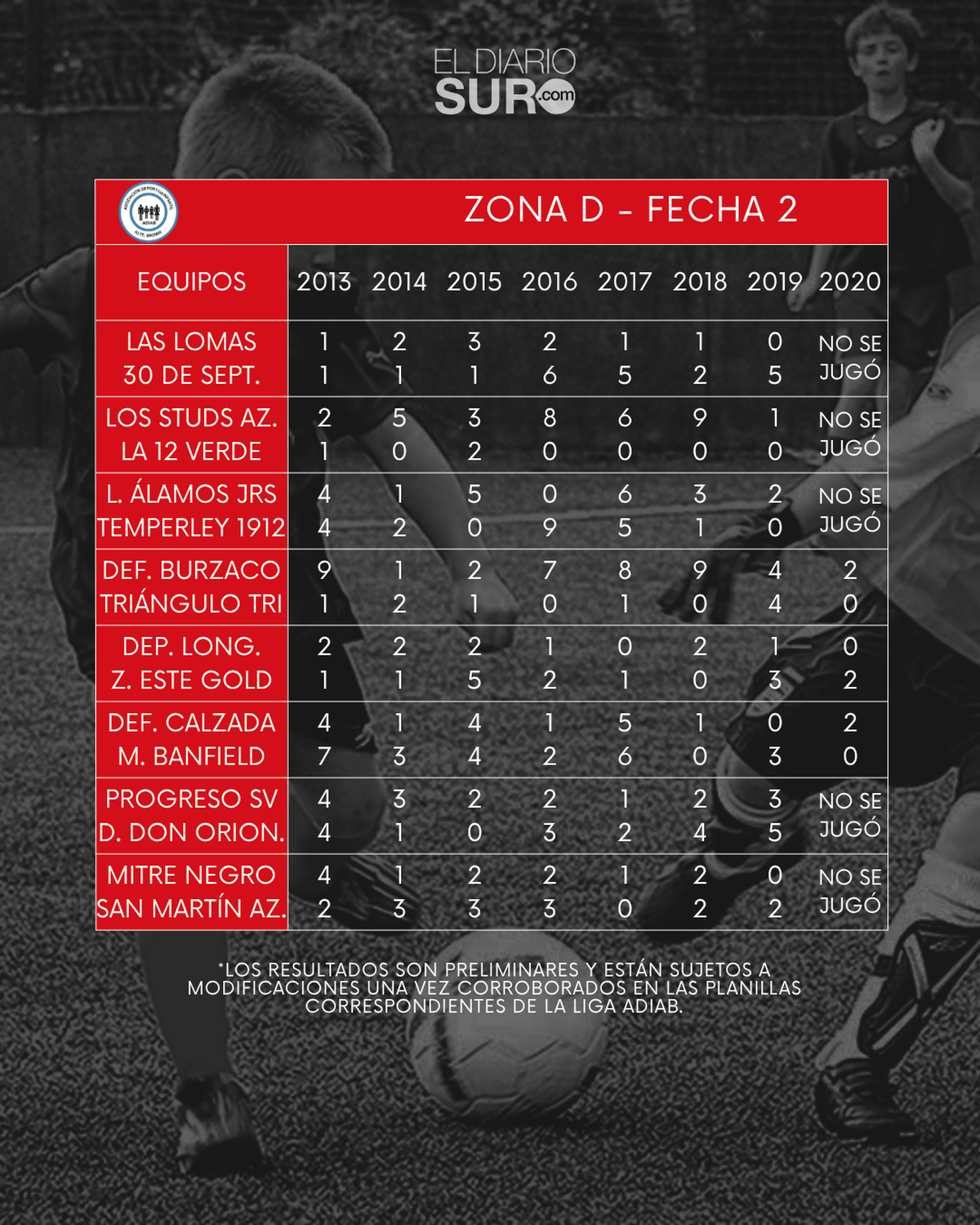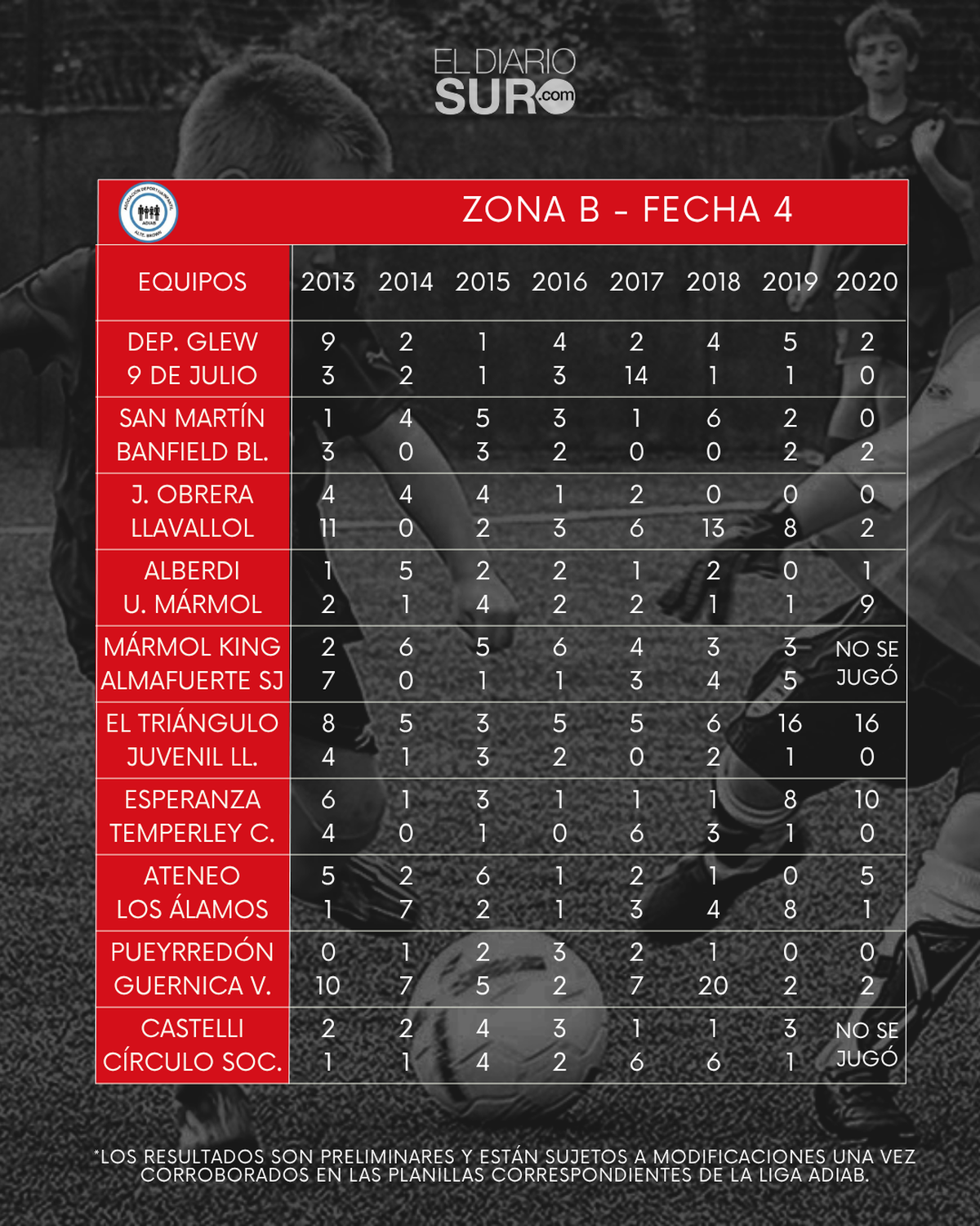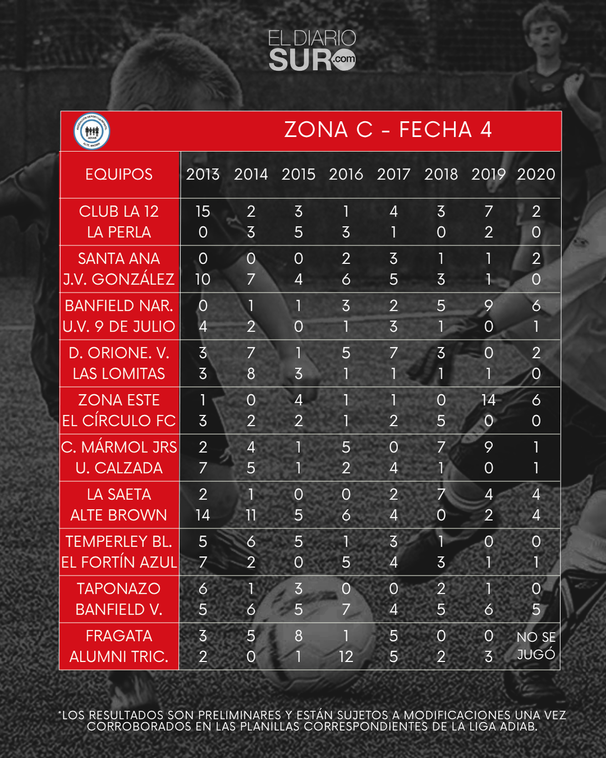 En ese sentido, los resultados son preliminares y están sujetos a modificaciones una vez corroborados en las planillas correspondientes de la liga ADIAB. No son información definitiva.
