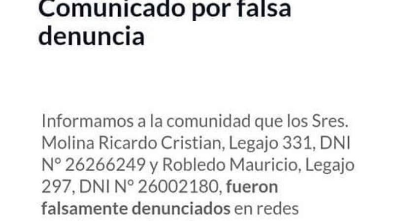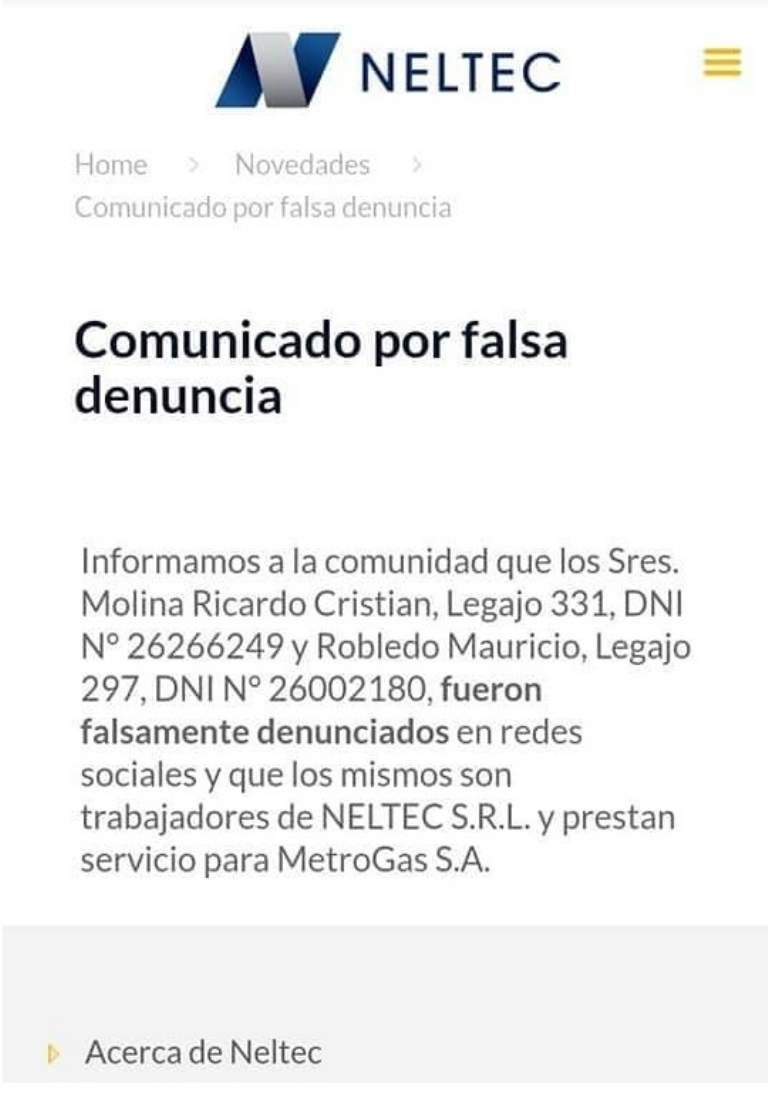 Como respuesta a esta falsa acusación, Robledo Mauricio emitió una denuncia penal en el que explica que él en verdad es empleado de NELTEC S.R.L y que, a causa de la publicación en la red social, tuvo problemas laborales, ya que él debe seguir trabajando por la zona y esto lo perjudica. Además, recibió un llamado telefónico por parte del Secretario gremial de la empresa.