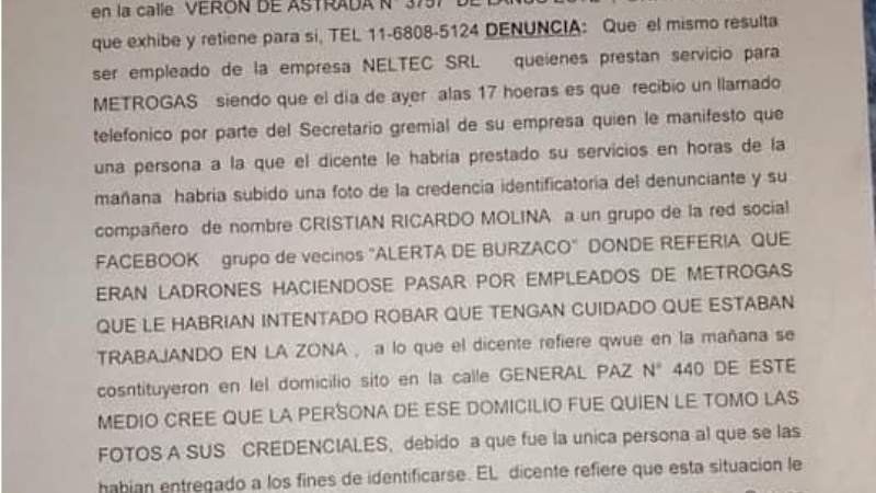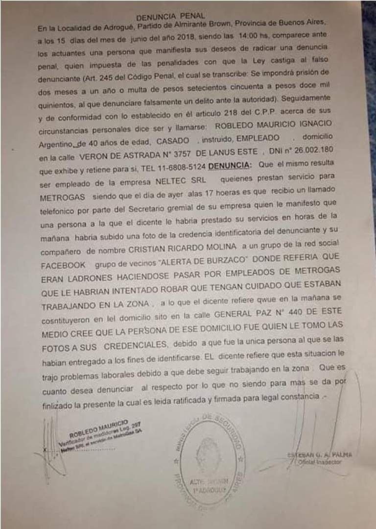 Robledo Mauricio y Cristian Ricardo Molina fueron falsamente acusados de ladrones en un grupo vecinal de Facebook, llamado Alerta de Burzaco. En este mismo una persona subió una foto de la credencial identificadora de los dos empleados de la empresa NELTEC S.R.L, que a su vez prestan servicio para MetroGas y que se refería a ellos como dos ladrones haciéndose pasar por trabajadores de MetroGas que le habían intentado robar y que tengan cuidado que estaban trabajando por la zona de Adrogué.