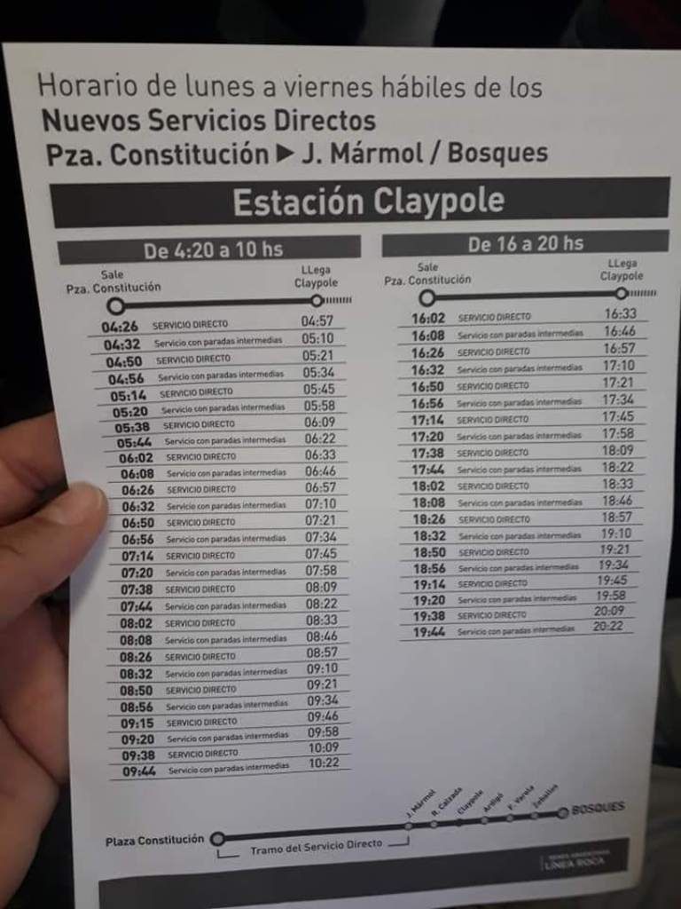 Cronograma de horarios entre Plaza Constitución - Claypole