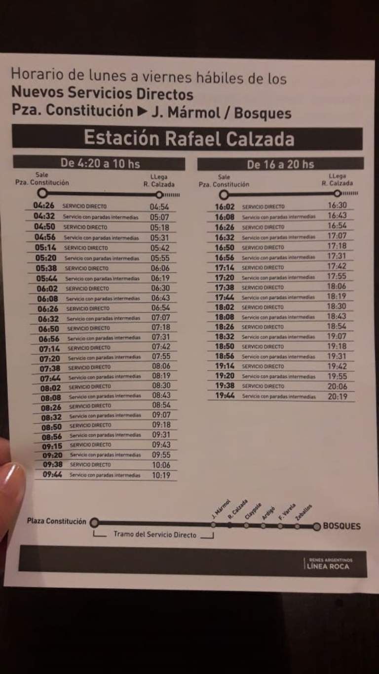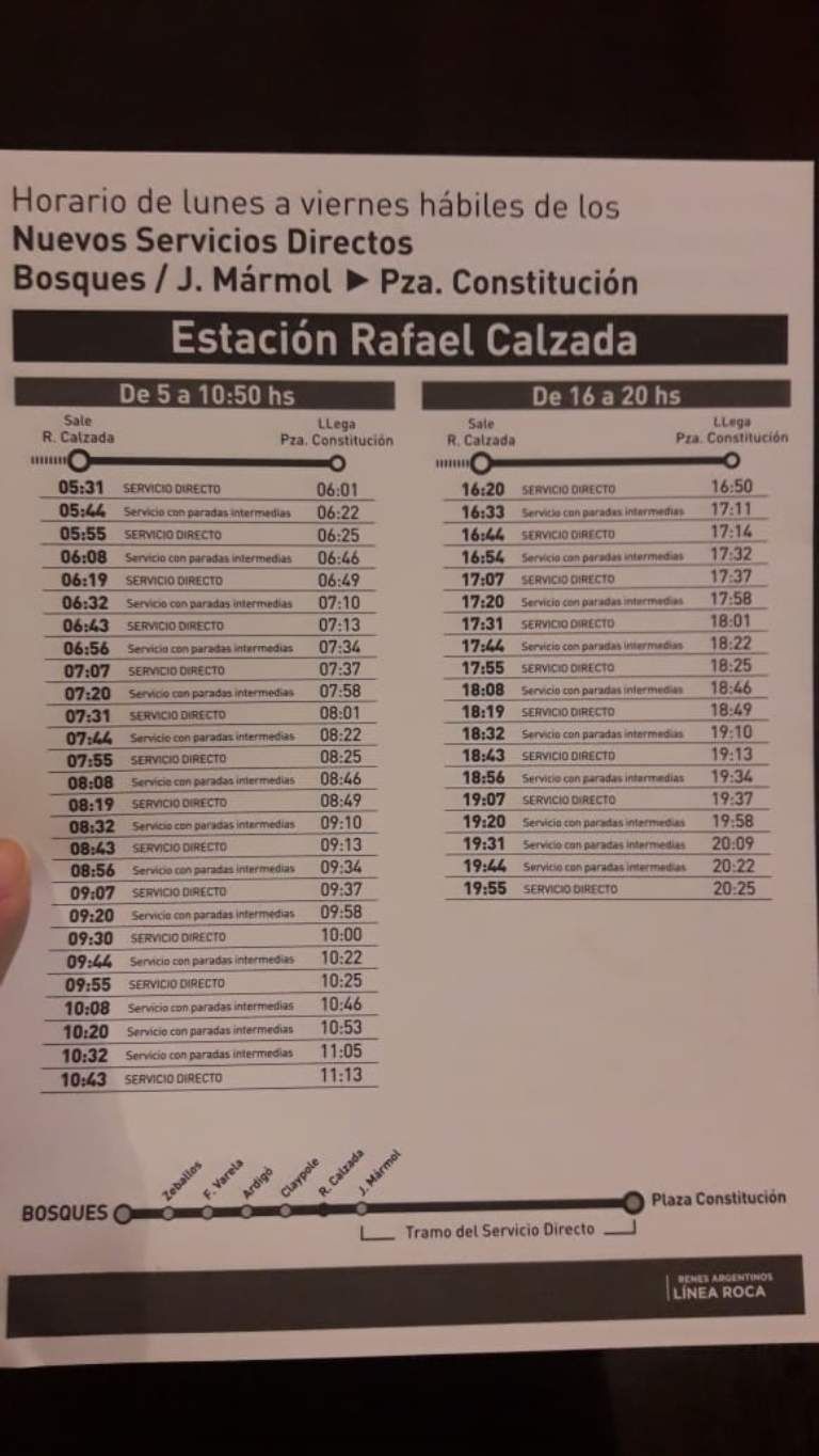 A partir del 10 de diciembre, el ramal Bosques del Tren Roca incorporará un nuevo servicio. Se trata de los viajes directos, los cuales no tendrán paradas en las estaciones intermedias entre José Mármol y Plaza Constitución.