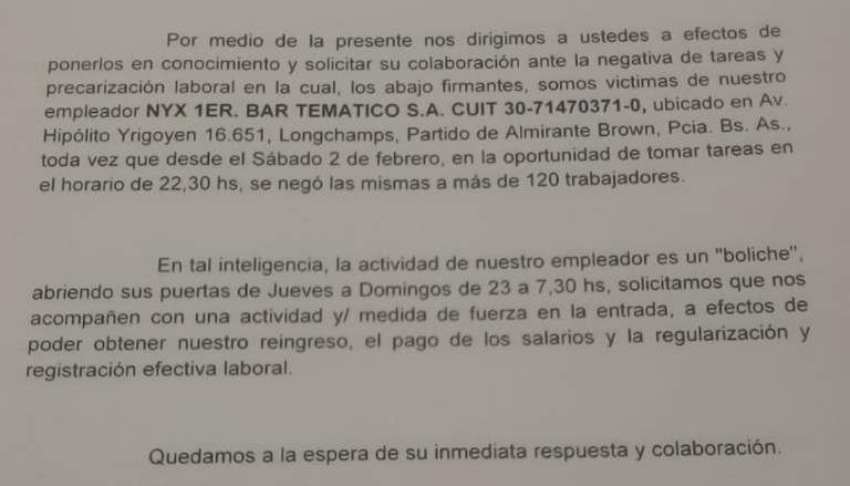 Los empleados realizaron un petitorio al dueño del complejo para que pueda aclarar su situación, ya que según cuenta Tomás "la mayoría estamos en negro y mal pagados", además de que no recibieron ningún tipo de notificación.