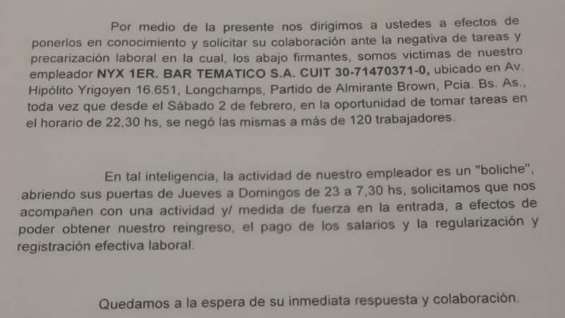 Unos 120 empleados de NYX, el complejo bailable y bar temático ubicado sobre la avenida Hipólito Yrigoyen al 16500 en la localidad de Longchamps, denuncian que fueron despedidos sin previo aviso el pasado fin de semana.