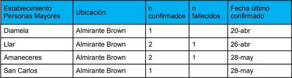 Según los datos brindados por la Dirección Epidemiología, los cuales corresponden hasta el 1° de junio, en el municipio se registraron seis casos positivos y dos fallecidos. Los mismo se distribuyen en cuatro centros de adultos mayores.