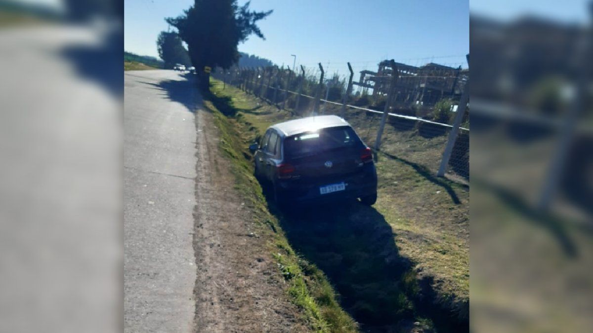 El Volkswagen Gol Trend que cayó al zanjón cuando se dirigía desde la ruta hacia la zona de barrios privados. Se desconoce los motivos por los que el auto perdió el control. En ese espacio se encuentran los countries El Principado, Los Talas y San Felipe, entre otros.